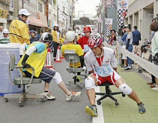 近日,第11屆日本辦公椅競(jìng)速賽在日本岡山縣倉敷舉辦。今年有71支參賽隊(duì)伍,每支隊(duì)伍有3名成員,參與者要經(jīng)過30米的直線預(yù)選賽,最終決賽是180米環(huán)形賽道。