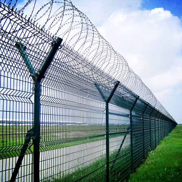 機場圍網(wǎng) 機場圍界 機場護欄網(wǎng)近年來,被廣泛應(yīng)用在機場,軍事基地等高安全場所.注:如果在機場護欄網(wǎng)頂部加裝刀片刺絲,刀片刺繩后又很好