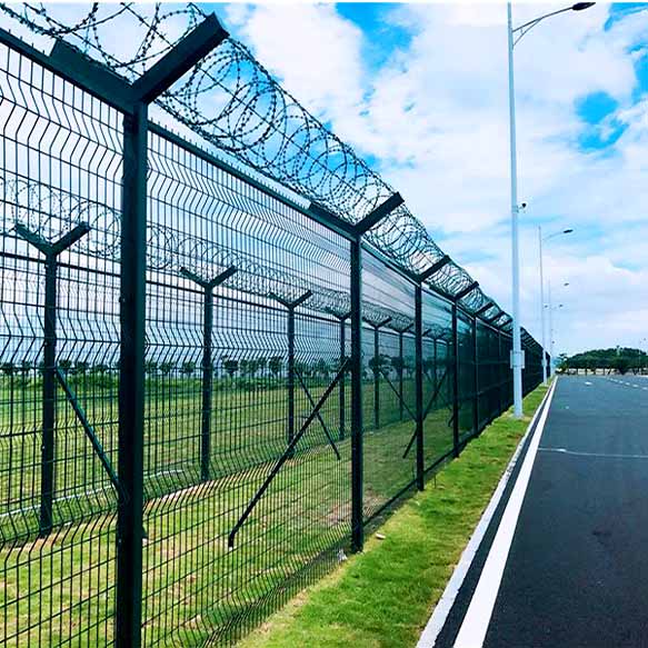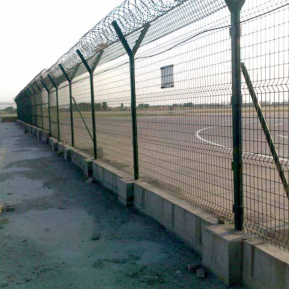 機場圍網(wǎng) 機場圍界 機場護欄網(wǎng)又叫鋼筋網(wǎng)圍界,主要用V型支架立拄,加強型焊接片網(wǎng),安全防盜連接件和熱鍍鋅刀片刺籠組成強度和安全