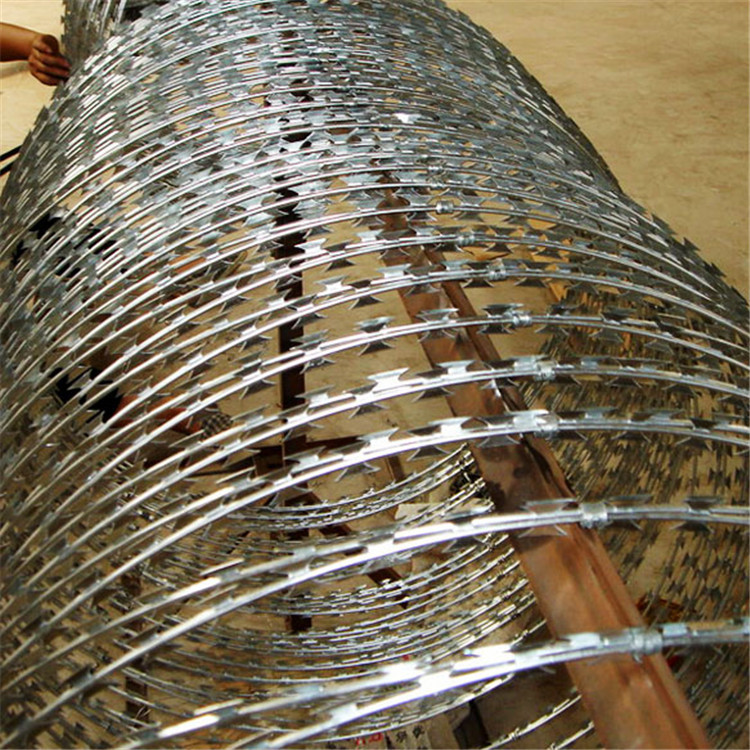 它采用鋼板(刀板)沖壓成型包附于熱鍍鋅鋼絲(芯線)之上,由銳利尖角鍍鋅鋼板或
