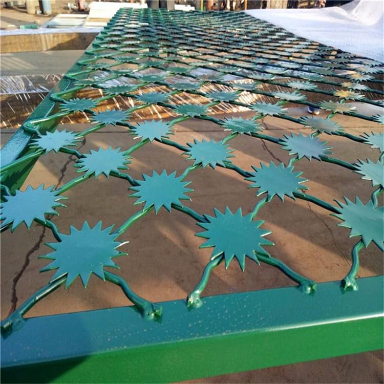 1、梅花刺片:梅花刺片直徑不小于7.5cm(直徑6cm、7cm、8cm),刺片厚1.5mm,采用Q235低碳鋼板沖壓成型。梅花刺片用氬弧焊將梅花形刺片焊接在美格網(wǎng)的節(jié)點上,形成刺形保護,有效的防止了手握腳攀。