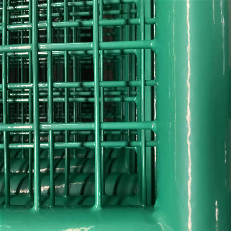 金屬網(wǎng)片及柵欄門的網(wǎng)片成形后應(yīng)整體鍍鋅并進(jìn)行熱浸塑(或噴塑)處理,浸塑厚度0.8mm~1.2mm,顏色選用墨綠色。涂層應(yīng)均勻,顏色一致,表面光滑,無流柱,滴瘤、粉泡、漏鐵等缺陷。