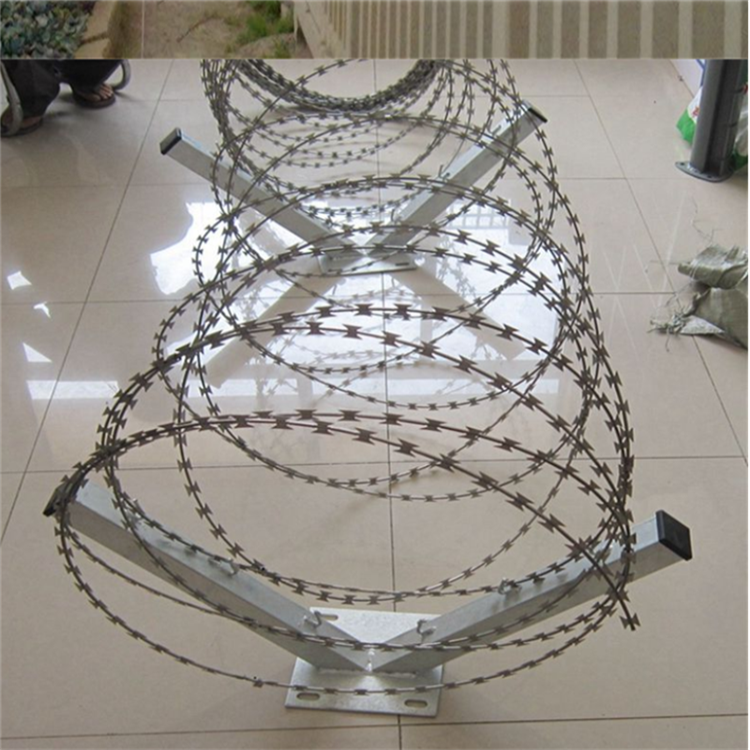 當(dāng)如果有人想攀爬翻越,網(wǎng)狀的刀片刺網(wǎng)刀片鋒利,手不能握,腳不能攀登,堅決可以阻止人的逾越的防護墻,具有很強的恐嚇和阻止的效果,既美觀又有實際效果顯著。由于刺網(wǎng)造形獨特不易觸摸,因而能達到極好的防護隔離的效果。