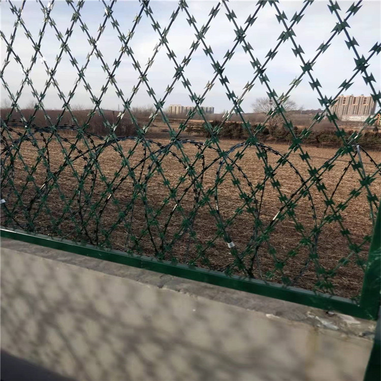 三、刀刺片隔離網(wǎng),網(wǎng)片是以交叉型刀片組成的菱形孔框架網(wǎng),防攀爬效果更好,刀型鋒利,美觀耐用;