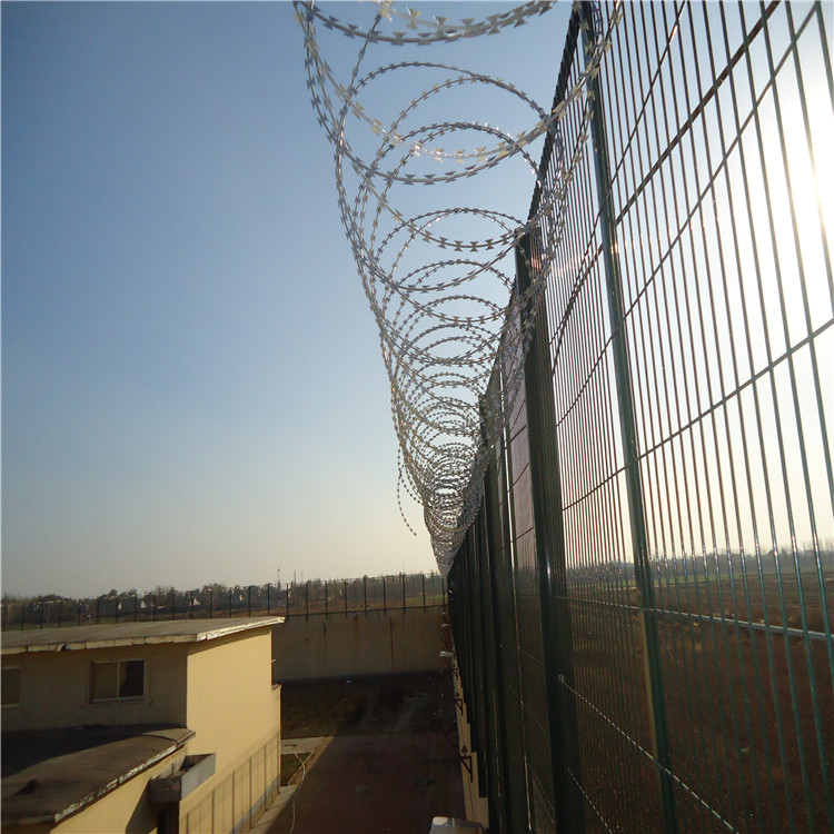 看守所隔離柵欄-巡道防護(hù)網(wǎng)上部會安裝刀片刺網(wǎng)(刺絲滾籠),刀片刺網(wǎng)具有嚇阻、防翻越的效果,材質(zhì)堅(jiān)硬,高強(qiáng)度,高張力,造型設(shè)計(jì)獨(dú)特,不宜觸摸,因而能達(dá)到極好的防護(hù)隔離效果。看守所隔離柵欄-巡道防護(hù)網(wǎng)還具有施工簡便,經(jīng)濟(jì)實(shí)用等優(yōu)點(diǎn).