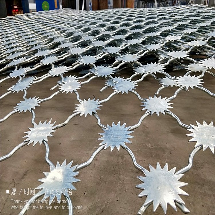 梅花刺網(wǎng)又稱監(jiān)獄護(hù)欄網(wǎng)或監(jiān)獄隔離柵,主要是采用高強度的刀片刺網(wǎng)與普通防護(hù)網(wǎng)的結(jié)合,由V型支架立拄,加強型焊接片網(wǎng),安全防盜連接件和刀片刺網(wǎng)組成.刀片刺網(wǎng)是一種新型防護(hù)網(wǎng),由銳利尖角鍍鋅鋼板或不銹鋼薄板做刀片,鋼絲做芯線組合而成的防護(hù)器材梅花刺網(wǎng)又稱高安全防護(hù)網(wǎng)、監(jiān)獄防護(hù)網(wǎng),是用氬弧焊將梅花形刺片焊接在美格網(wǎng)的節(jié)點上,形成刺形保護(hù),有效的防止了手握腳攀,為此該鋼網(wǎng)墻在監(jiān)獄或看守所使用。