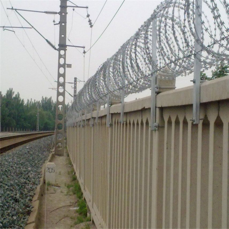 刺絲滾籠由刺絲連接卡扣與固定在支架上的縱向拉筋相連接,縱向拉筋與支架的連接采用?2.5mm的冷拔鍍鋅鋼絲繞2圈后擰緊固定,支架設(shè)置在跨度3m防護(hù)柵欄的立柱和跨中位置,其他跨度僅設(shè)置與立柱上部,支架與防護(hù)柵欄采用支架抱箍連接。