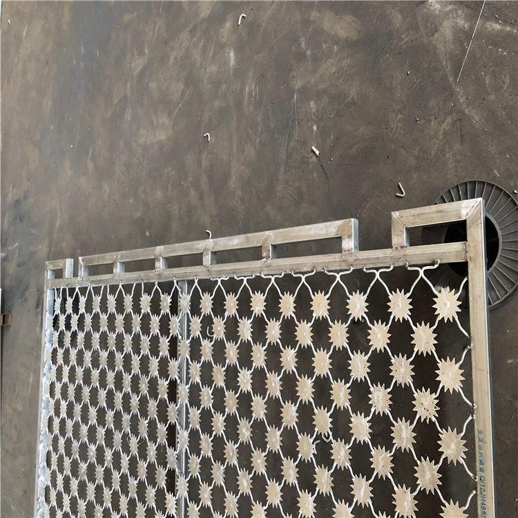 刀刺網(wǎng):一般為不銹鋼304刀刺網(wǎng),常用外圈徑為中500mm ,中600mm ,少數(shù)用中800mmV型網(wǎng): .可以加也可以不加, 一般為焊接型網(wǎng)片,大部分直接用4道拉絲代替,拉絲一般為中3.0或4.0mm的熱鍍鋅絲/不銹鋼絲,或者配普通刺繩14#