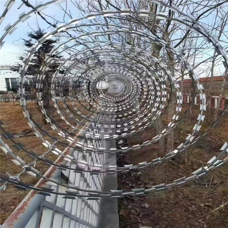 不銹鋼刀片刺繩可防盜色澤潔白發(fā)亮,鋅層厚、刀片分布均勻、刀片鋒利不易產(chǎn)品特點:生銹、牢固耐用低碳鋼絲、焊點抗拉力強、支撐力大抗拉力強、使用壽命長可廣泛用于許多學(xué)校、小區(qū)、家用、園林公寓、邊防。