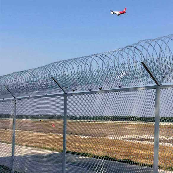 機(jī)場圍網(wǎng)主要是采用高強(qiáng)度的刀片刺網(wǎng)與普通防護(hù)網(wǎng)的結(jié)合,由V型支架立拄,加強(qiáng)型焊接片網(wǎng),安全防盜連接件和刀片刺網(wǎng)組成.刀片刺網(wǎng)是一