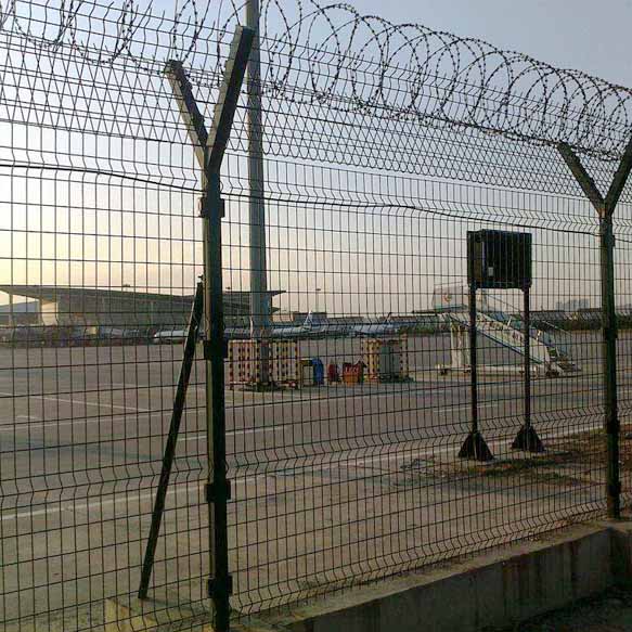 機(jī)場圍網(wǎng)具有安全性高、防攀爬能力好,網(wǎng)片連接方法選用特制SBS緊扣件,有效避免人為的破壞性拆卸,橫向四道折彎加強(qiáng)