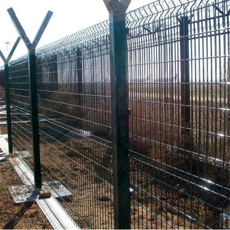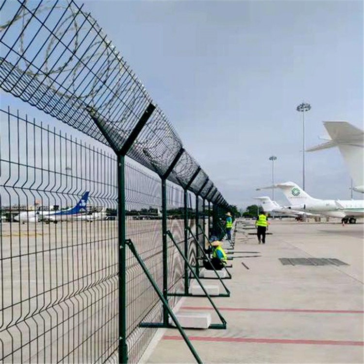 機場圍界采用寬為2.5米,高度為2.5米的帶V型加強筋網(wǎng)片及60*60mm(80*80mm)的立柱組成,其中網(wǎng)片網(wǎng)孔為50*75mm、50*100mm、50*150mm,絲徑為φ5mm高強度低碳鋼絲,立柱壁厚為2-4mm,立柱頂端加裝φ500mm或φ600mm刀刺滾籠。